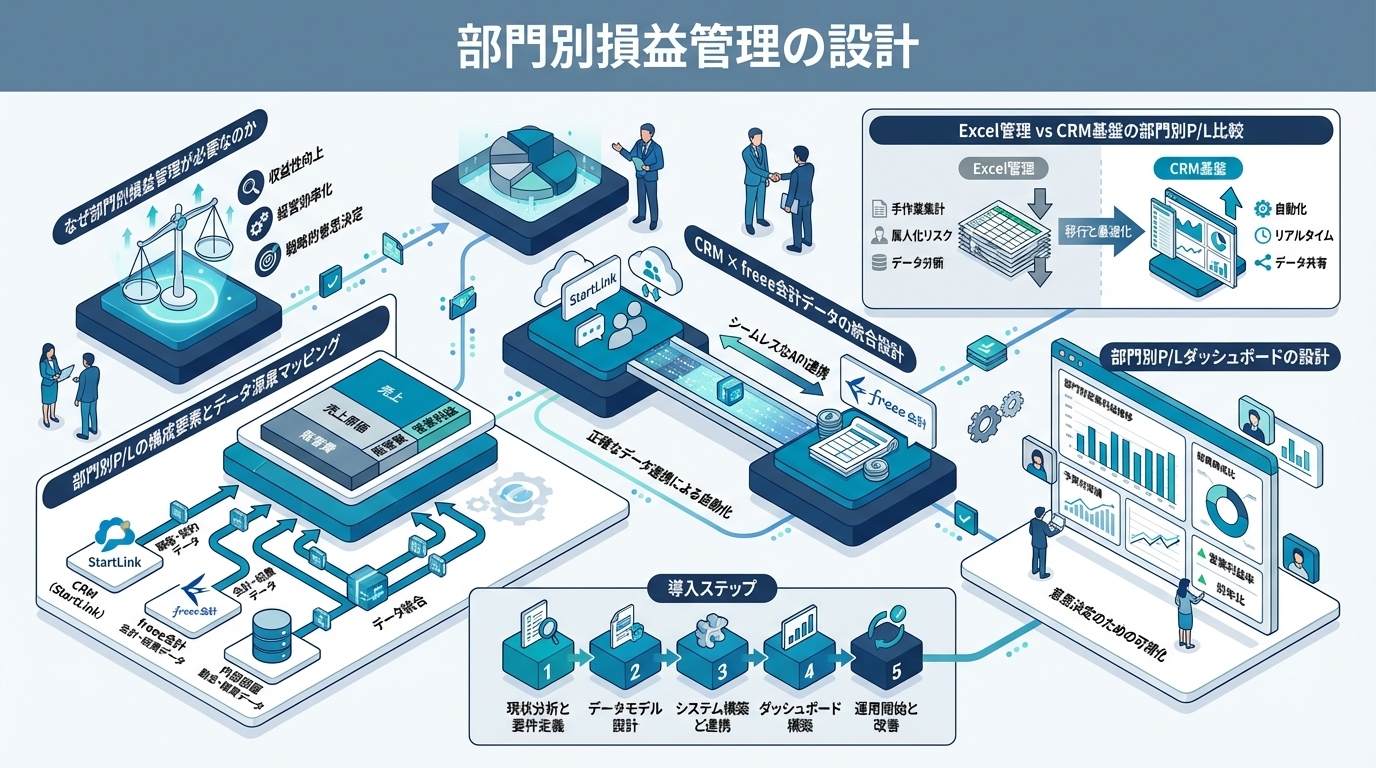 metaDescription: 部門別損益管理をCRM×会計データ連携で実現する方法を解説。CRM商談データとfreee会計データを事業部コードで統合し、部門ごとの売上・粗利・営業利益を自動で可視化する設計手法、間接費の按分ルール、Excel脱却の導入ステップまで紹介します。