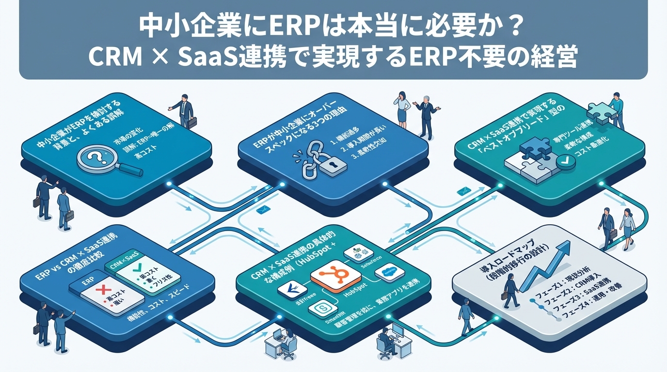 metaDescription: 中小企業にERPは本当に必要か?ERPが中小企業にオーバースペックになる理由を整理し、CRM(HubSpot)×SaaS連携で初期投資を抑えながら必要十分な経営基盤を構築する方法を、コスト比較・構成例(HubSpot+freee+board)・段階的導入ロードマップとともに解説します。