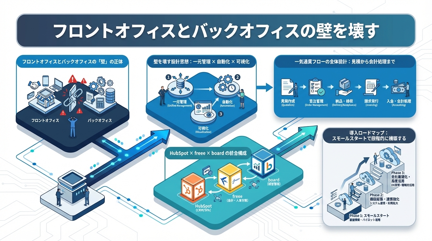 metaDescription: フロントオフィスとバックオフィスの間にある「データの壁」を解消する方法を解説。見積→受注→請求→入金→会計の一気通貫フローをHubSpot・freee・boardの3ツール連携で構築する具体的な設計図と、スモールスタートで進める段階的な導入ロードマップを紹介します。