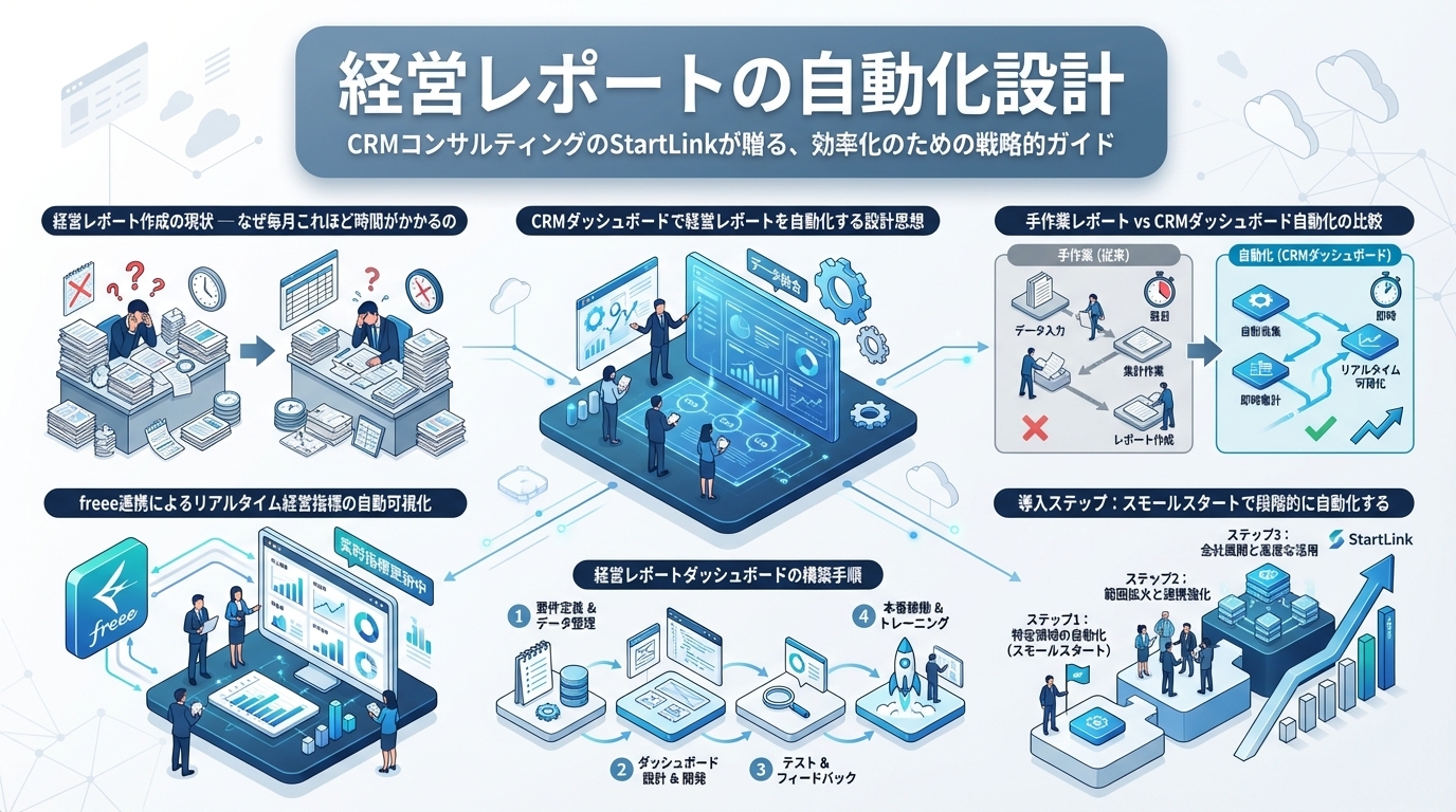 title: 経営レポートの自動化設計|CRMダッシュボードでリアルタイム経営を実現する