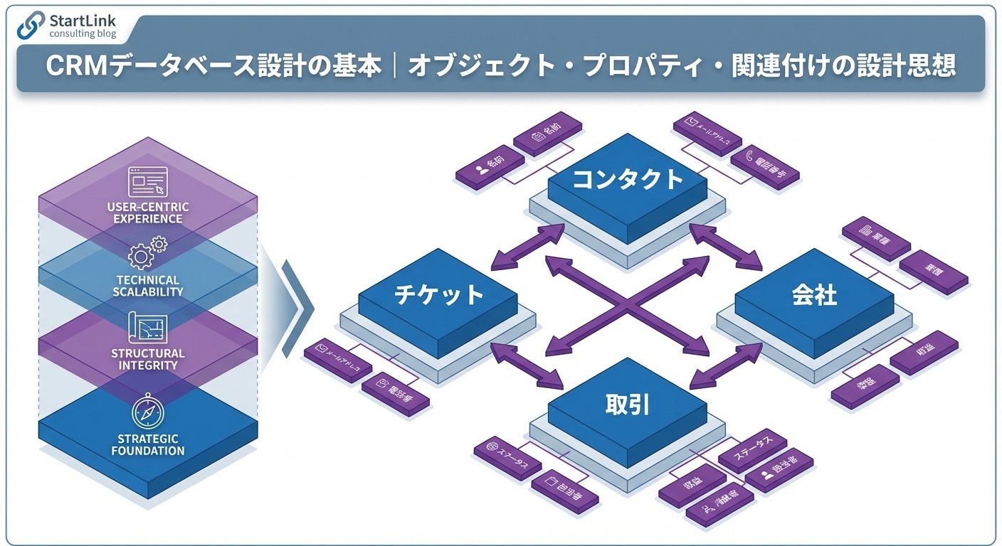 CRMデータベース設計は、「オブジェクト」「プロパティ」「関連付け(アソシエーション)」の3つの構成要素で成り立っています。この設計の良し悪しが、CRM運用の成否を根本から左右します。