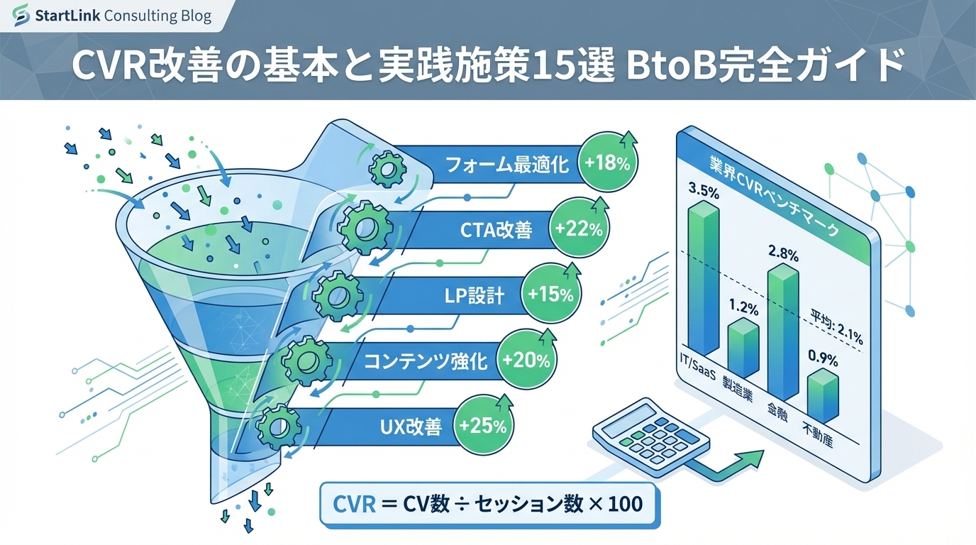 本記事では、CVRの基本的な定義・計算式からBtoB業界の平均値、そして実務で即活用できる15の改善施策を体系的に解説します。フォーム最適化、CTA改善、LP設計、コンテンツ強化、UX改善の5つの切り口で整理しているため、自社の課題に合った施策から着手できます。