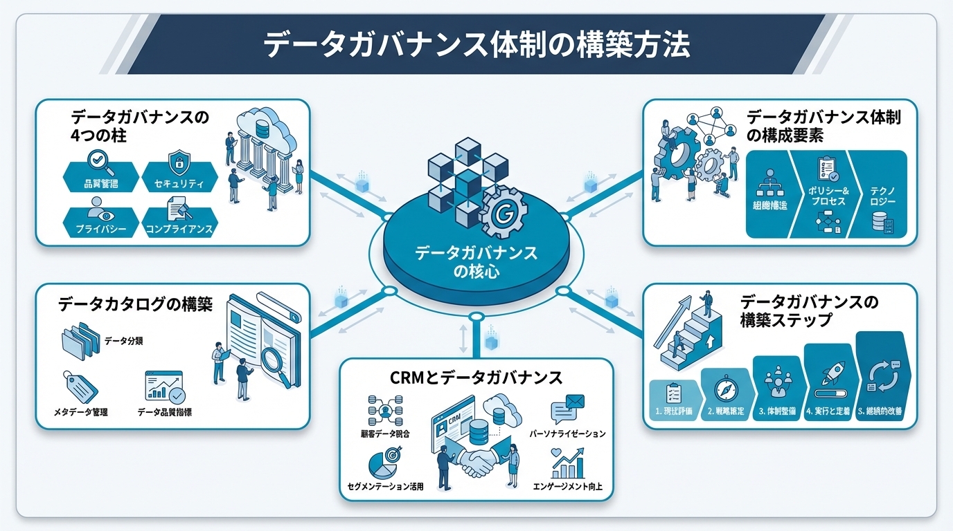 metaDescription: "データガバナンス体制の構築方法を解説。データ品質管理、アクセス制御、メタデータ管理、データカタログの活用まで、全社的なデータ管理の仕組みづくりをまとめます。"
