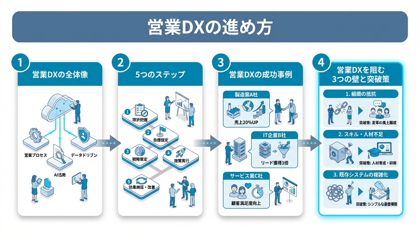 title: "営業DXの進め方|デジタル化で営業組織を変革する5つのステップと成功事例"