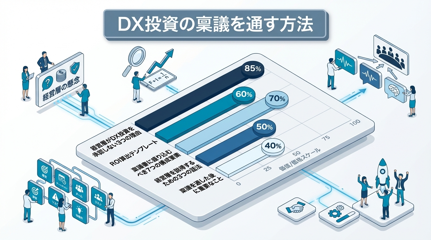 DX投資の稟議を通す鍵は「定量化」です。現状コストの数値化、投資効果のROI算出、ペイバック期間の明示。この3つがそろえば、経営層は合理的な投資判断ができます。