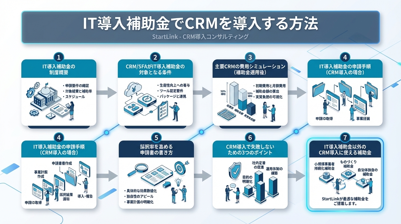 A4: 申請可能です。IT導入補助金はIT導入支援事業者と共同で申請する仕組みのため、申請書の作成からツール導入まで支援事業者がサポートしてくれます。StartLinkのようなCRM専門のコンサルティング会社であれば、申請支援から導入・定着までワンストップで対応できます。