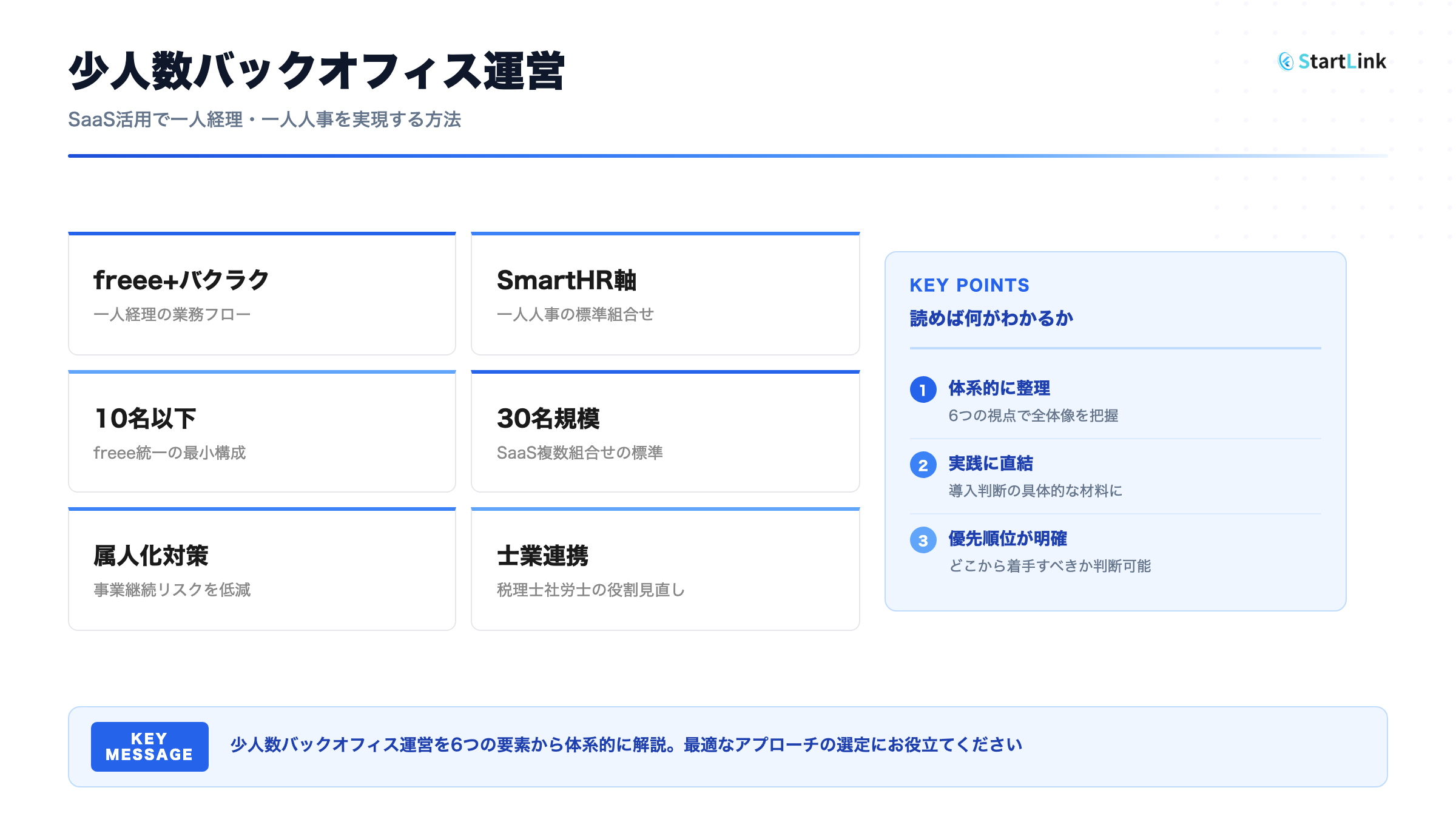 SaaS活用で一人経理・一人人事を実現する方法を体系的に整理しました。この記事を読むことで、少人数バックオフィスの運営の全体像を理解し、自社で実践するための具体的な知識が得られます。