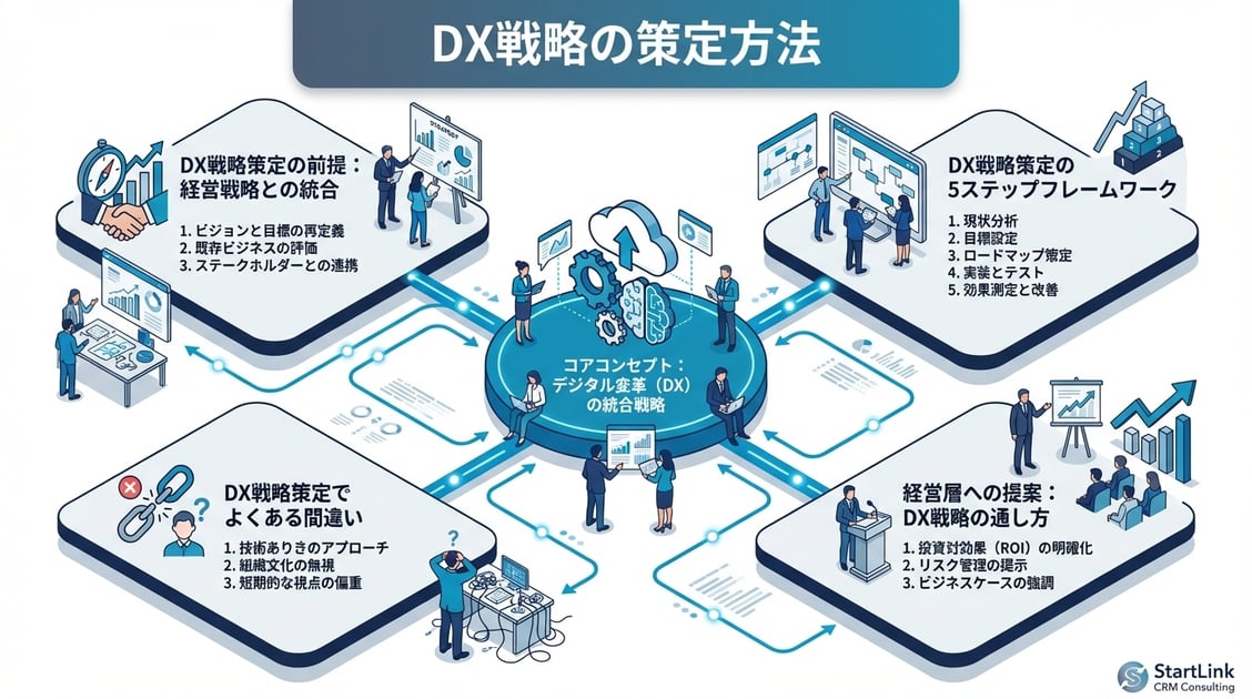 DX戦略は経営戦略と一体化させなければ「DXごっこ」に終わります。策定は「現状分析→To-Be設計→ギャップ分析→ロードマップ設計→KPI設計」の5ステップで進め、Quick Win(短期成果)と中長期の変革を両立させることが重要です。初年度はCRMを中核としたデータ統合基盤の構築から着手するのが最も効果的です。