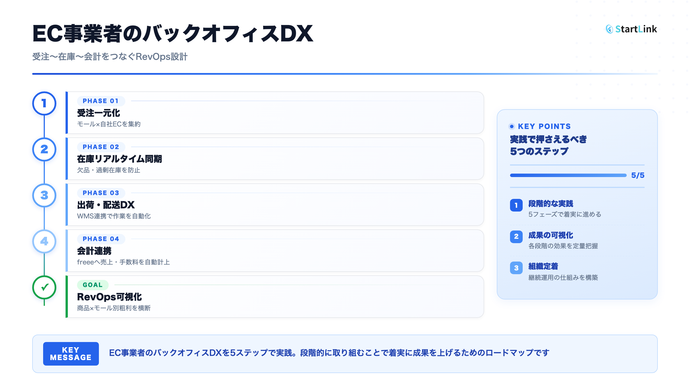 EC事業者のバックオフィスDXは、受注・在庫・会計・顧客データという4つの柱を連携させることが核心です。ポイントを整理すると次のとおりです。