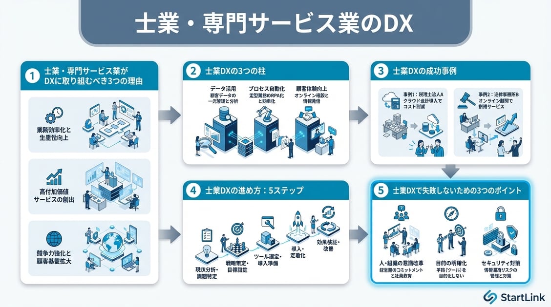 士業・専門サービス業のDXは、「顧問先管理のCRM化」「書類の電子化」「業務プロセスの自動化」の3本柱で進めるのが効果的です。法制度のデジタルシフト、属人化リスク、付加価値サービスへのシフトという3つの外部環境が、士業のDXを不可避にしています。
