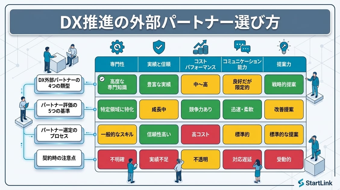 本記事では、外部パートナーの種類と特徴、評価基準、失敗しない選定プロセスを解説します。