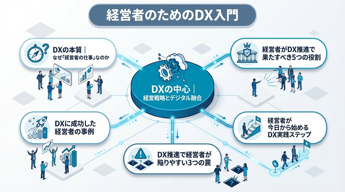 本記事では、DXの本質的な意味から経営者が果たすべき具体的な役割、そして明日から始められる実践ステップまで、経営者の視点で解説します。