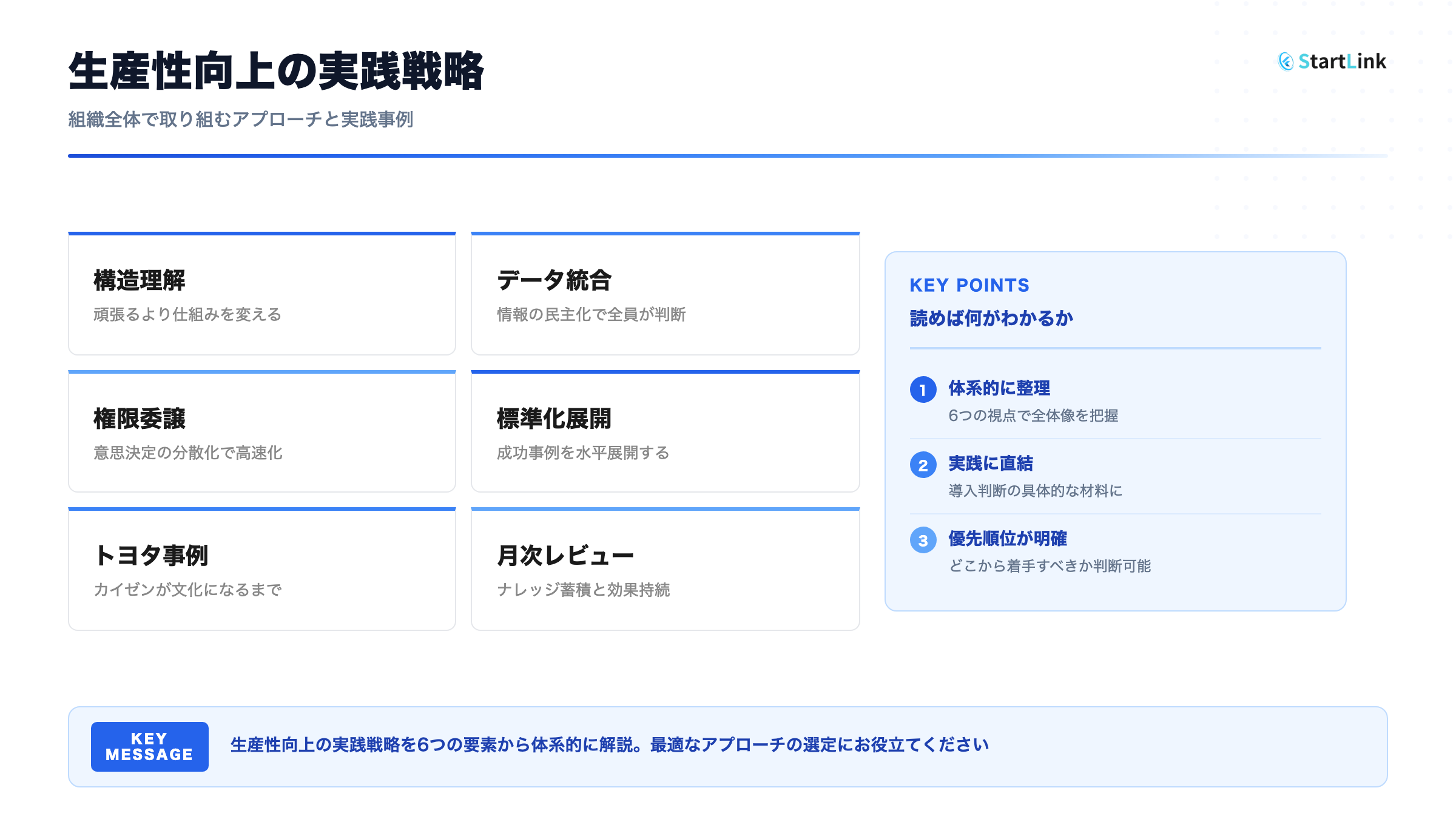 本記事では、個別の効率化施策ではなく、組織全体で生産性を向上させるための「戦略」と「仕組み」に焦点を当てます。