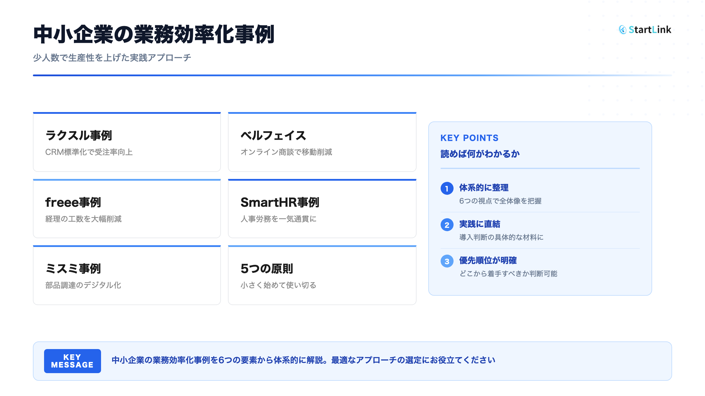 この記事を読むことで、中小企業の業務効率化成功事例の全体像を理解し、自社で実践するための具体的な知識が得られます。