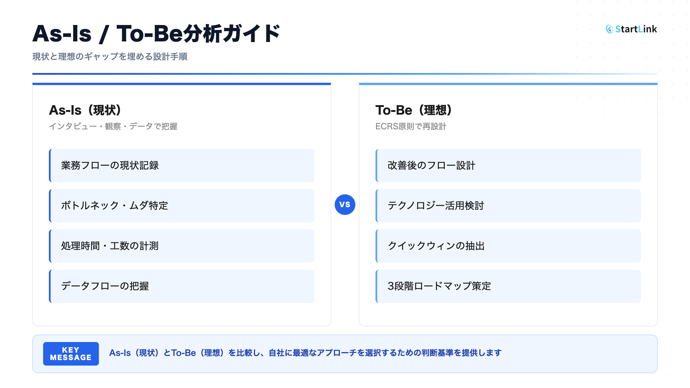 As-Is/To-Be分析は、業務改善を体系的に進めるための最も効果的なフレームワークです。