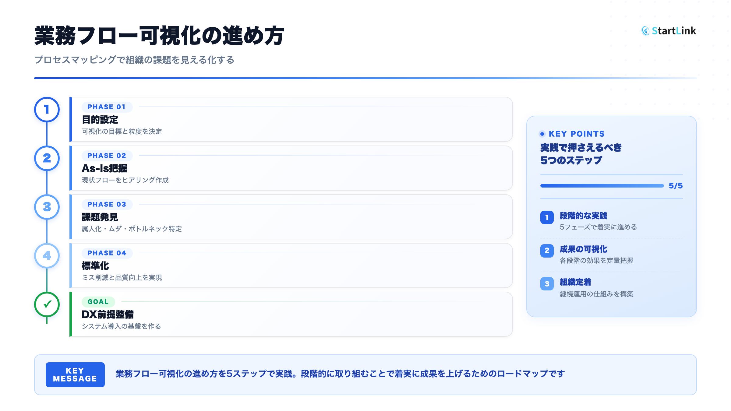 - 可視化がもたらす5つの経営メリット(属人化排除・コスト削減・品質向上・DX基盤整備・部門間連携改善) — 業務フローを可視化することで、「誰が・いつ・何を・どのように」処理しているかが明確になります。