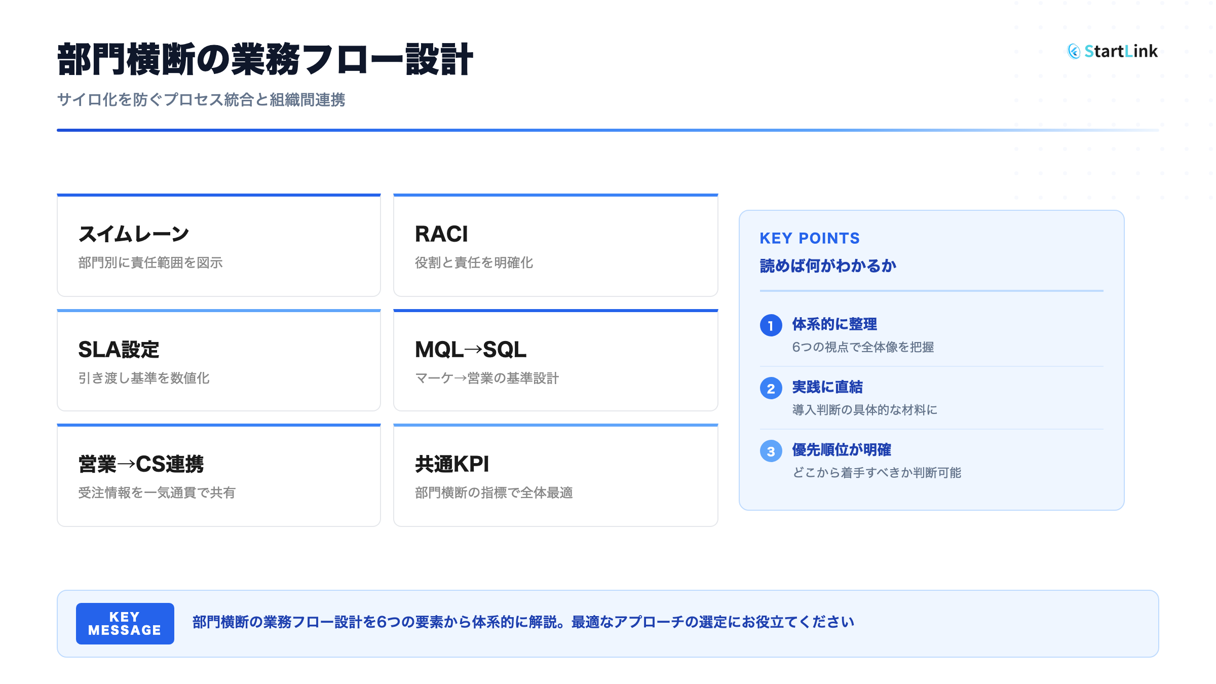 この記事を読むことで、部門横断の業務フロー設計の全体像を理解し、自社のサイロ化解消を実践するための具体的な知識が得られます。