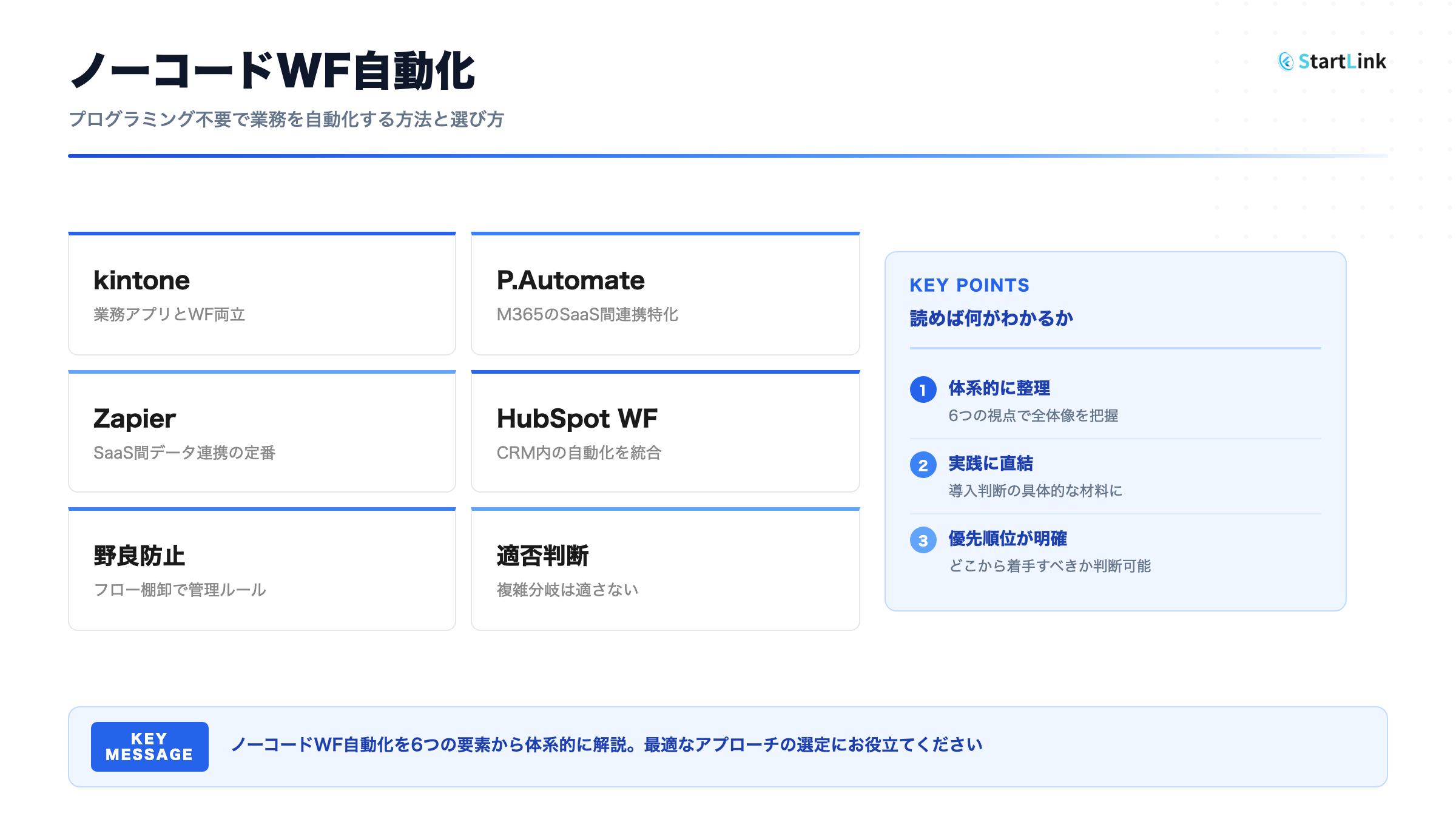 ノーコードツールによるワークフロー自動化は、業務効率化の進め方における具体的な実行手段として、定型的・繰り返し・シンプルな条件分岐の業務に対して非常に有効です。kintoneは業務アプリとの一体化、Power AutomateはMicrosoft 365との連携、ZapierはSaaS間連携、HubSpotは顧客対応プロセスの自動化にそれぞれ強みがあります