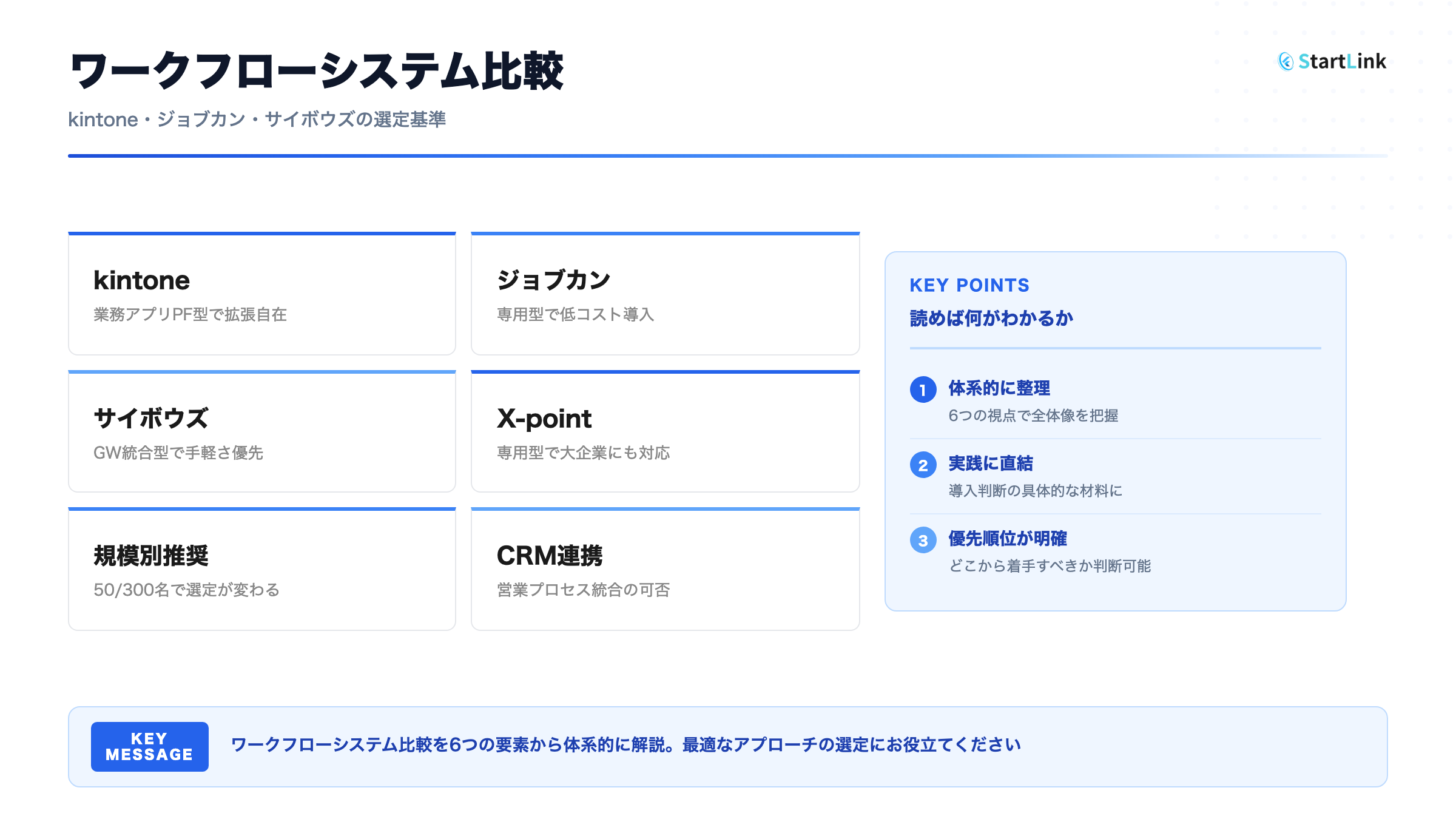 ワークフローシステムの選定は、「ワークフロー専用型」「グループウェア統合型」「業務アプリプラットフォーム型」の3カテゴリを理解した上で、自社の企業規模・導入目的・既存システムとの連携要件で判断します。kintoneは業務アプリ全体の構築に、ジョブカンはコスト重視のシンプルな電子化に、X-point Cloudは複雑な承認ルート設計にそれぞれ強みがあります
