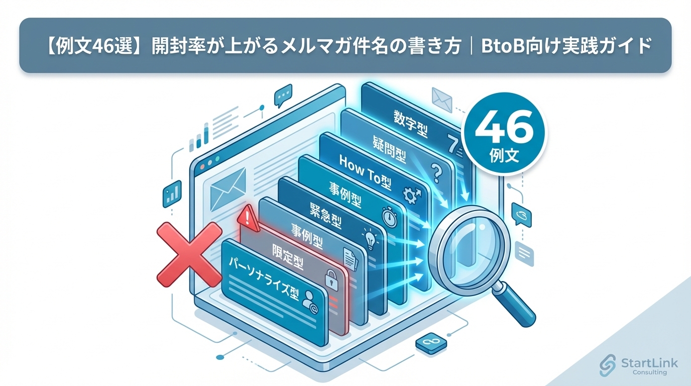 本記事では、BtoBメールで効果が実証されている7つの件名パターンと、各パターンの例文を合計46個ご紹介します。また、避けるべきNGパターン、最適な文字数、パーソナライゼーションの活用法まで、件名に関するノウハウを網羅的に解説します。