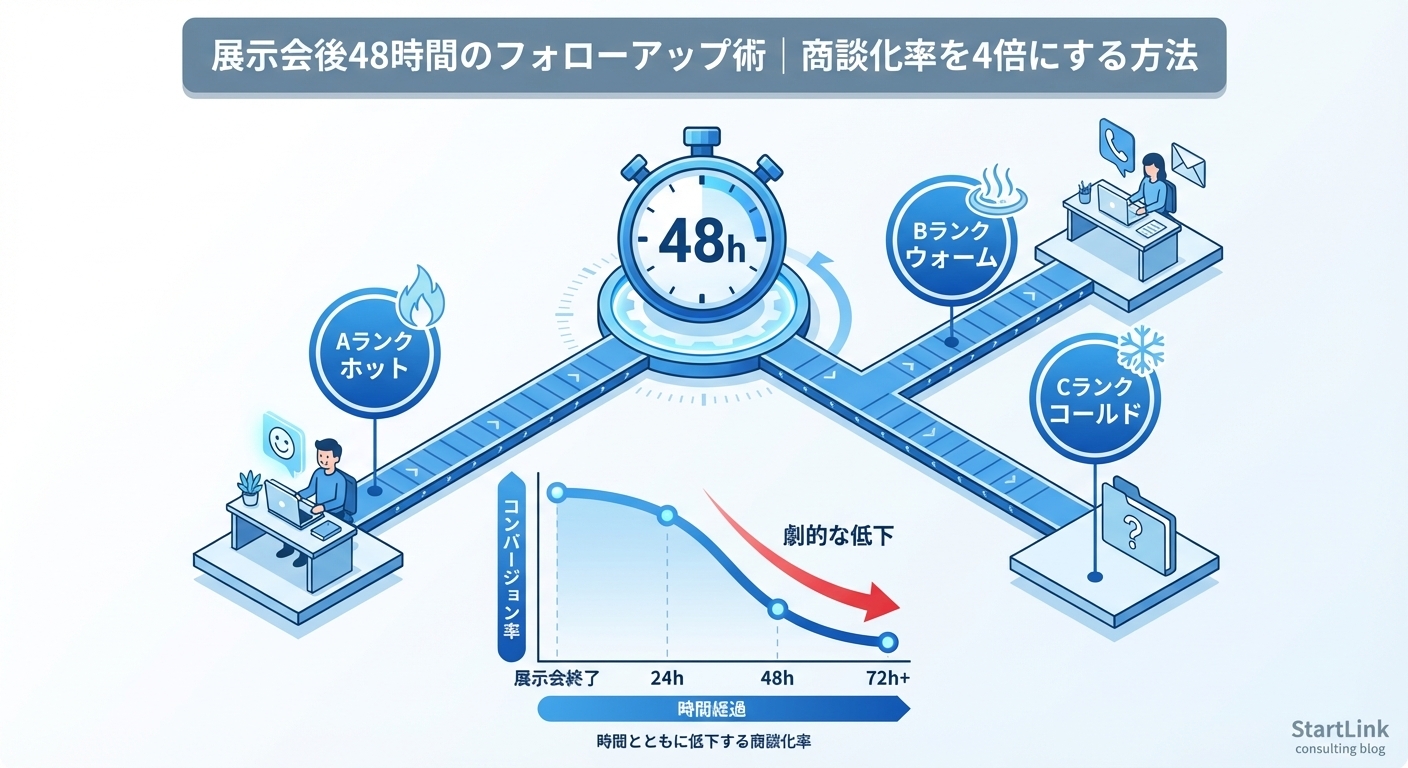 展示会後のフォローアップは、48時間以内のスピードが成果を決定的に左右します。リードをA/B/Cにランク分けし、それぞれに最適な手法とタイミングでフォローすることで、商談化率を4倍に引き上げることが可能です。