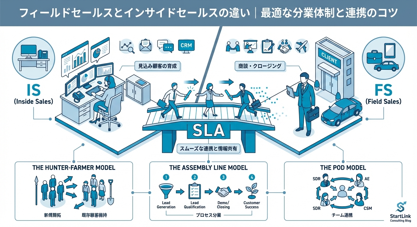 この記事では、フィールドセールスとインサイドセールスの違いを明確にし、最適な分業体制の3モデル、連携を成功させる5つのルール、SLA設計の方法まで実践的に解説します。