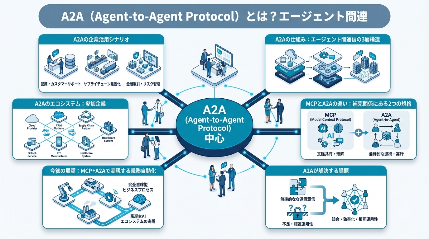 metaDescription: "GoogleのA2A(Agent-to-Agent Protocol)の仕組みとMCPとの違いを解説。異なるベンダーのAIエージェント同士が連携する標準規格の全体像と企業活用の可能性を紹介します。"