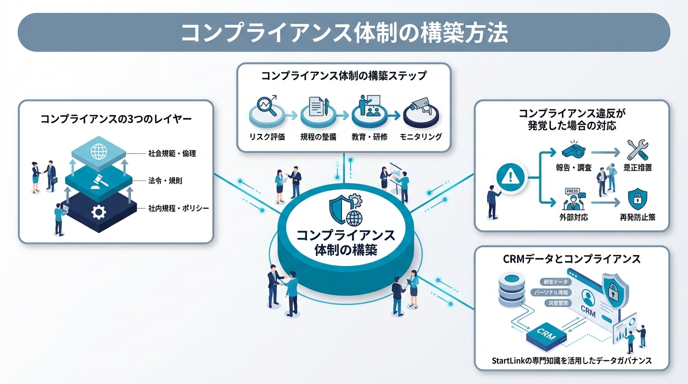 metaDescription: "コンプライアンス体制の構築手順を解説。法令遵守だけでないコンプライアンスの範囲、推進組織の設計、研修・内部通報制度の整備まで実務的なポイントを紹介します。"