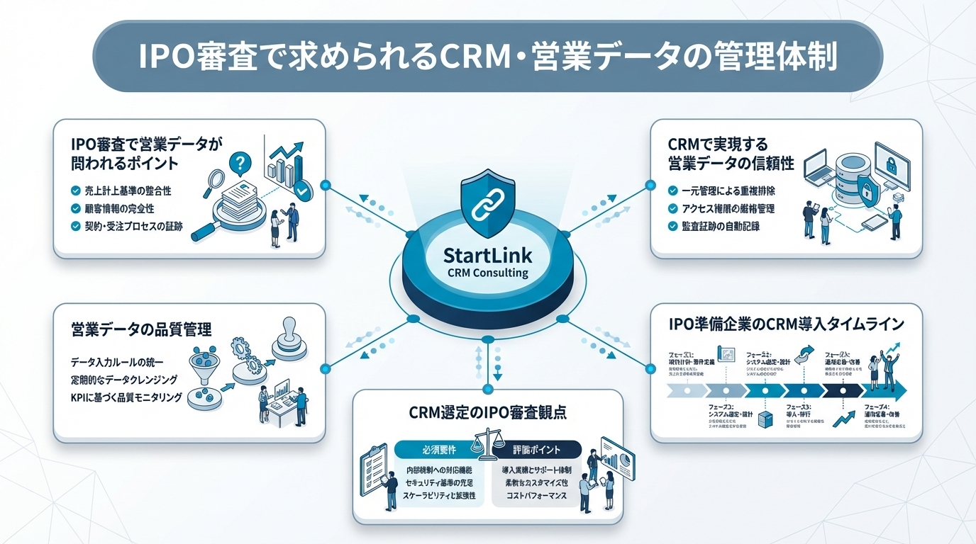 metaDescription: "IPO審査で求められるCRM・営業データの管理体制を解説。売上の信頼性担保、営業プロセスの可視化、データガバナンスの整備まで、CRM活用によるIPO対応のポイントを紹介します。"
