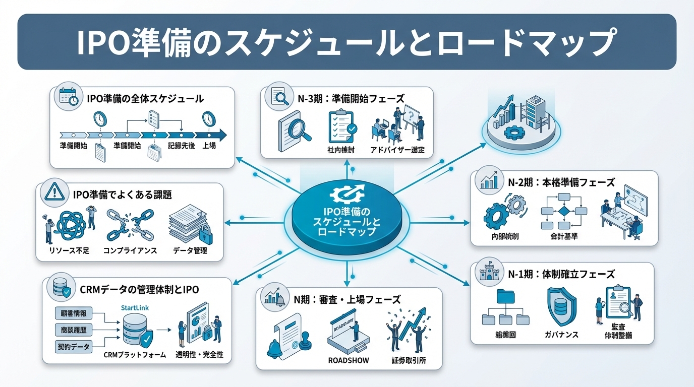 title: "IPO準備のスケジュールとロードマップ|上場までに必要な体制整備の全体像"