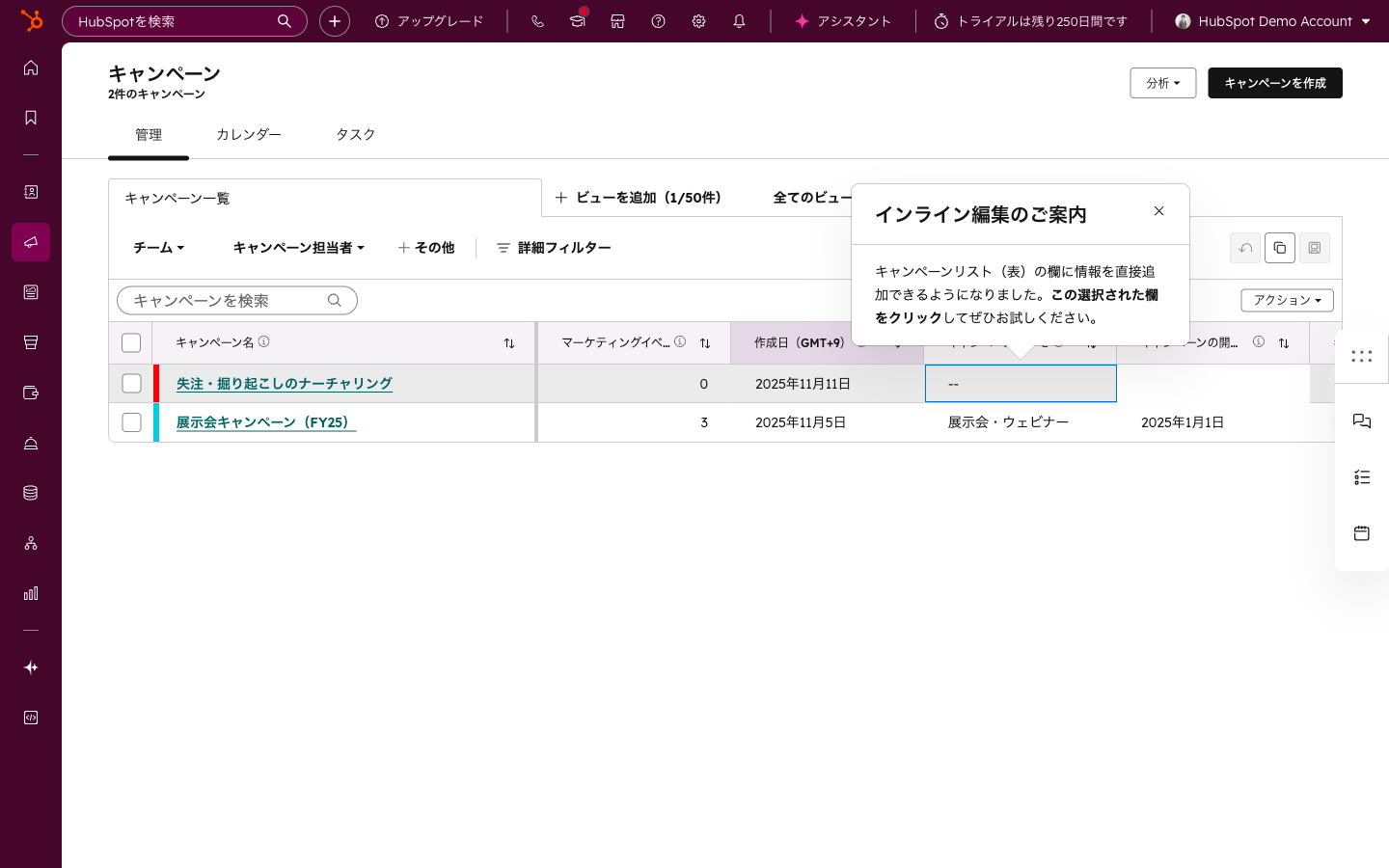 接続が完了すると、既存の広告キャンペーンが自動的にHubSpotの広告ダッシュボードにインポートされます。