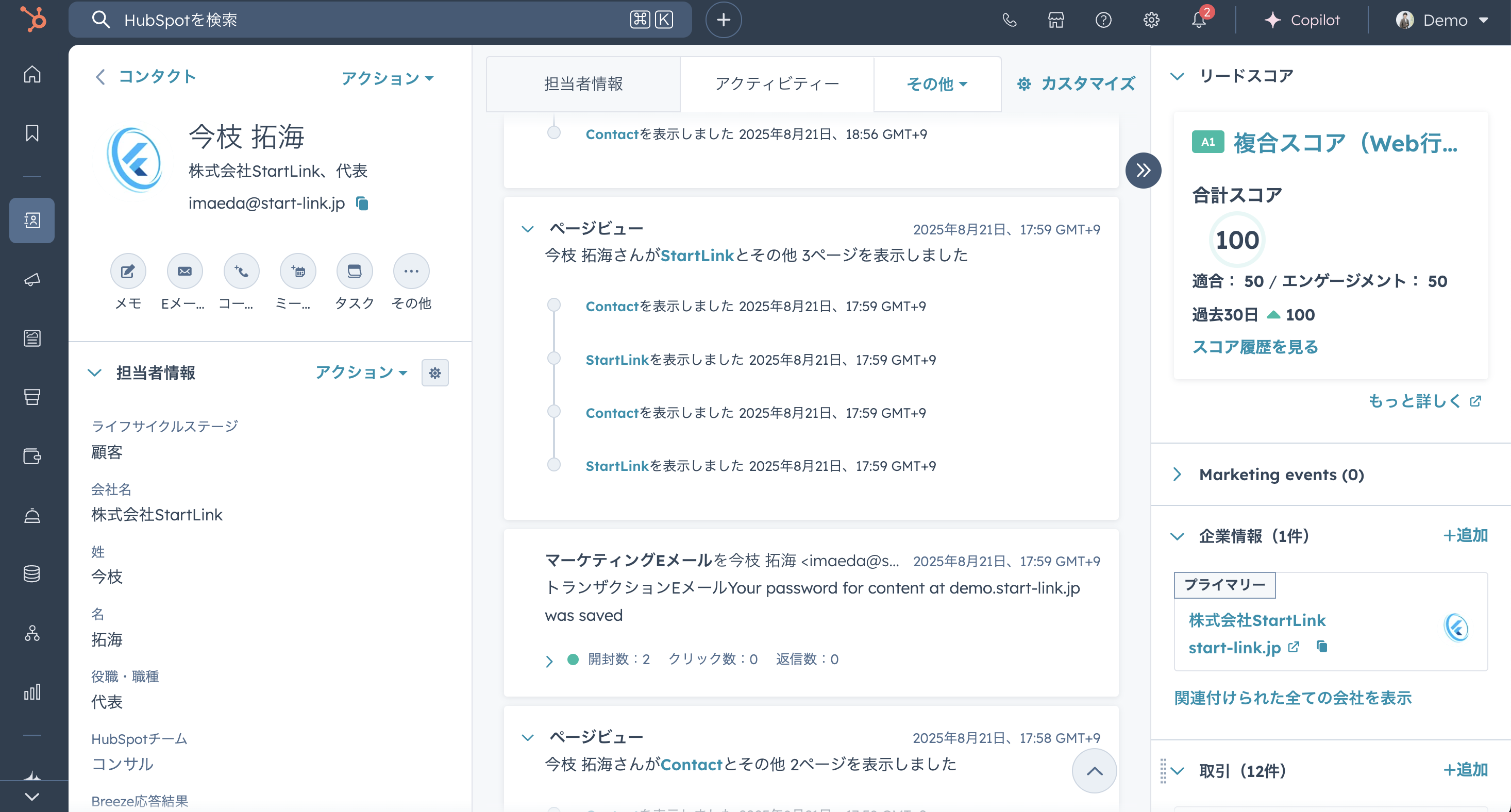 まず、HubSpotのトラッキングコードをウェブサイトに埋め込むだけで、訪問者がサイト内でどのようなページを閲覧し、どのコンテンツに興味を持ったかといった行動履歴が、コンタクト情報に自動的に紐づけられます。これにより、Aさんがどのブログを読んで、いつフォームを送信し、その後どんなメールを開封したか、といった顧客ジャーニーの全体像が手に取るようにわかります。