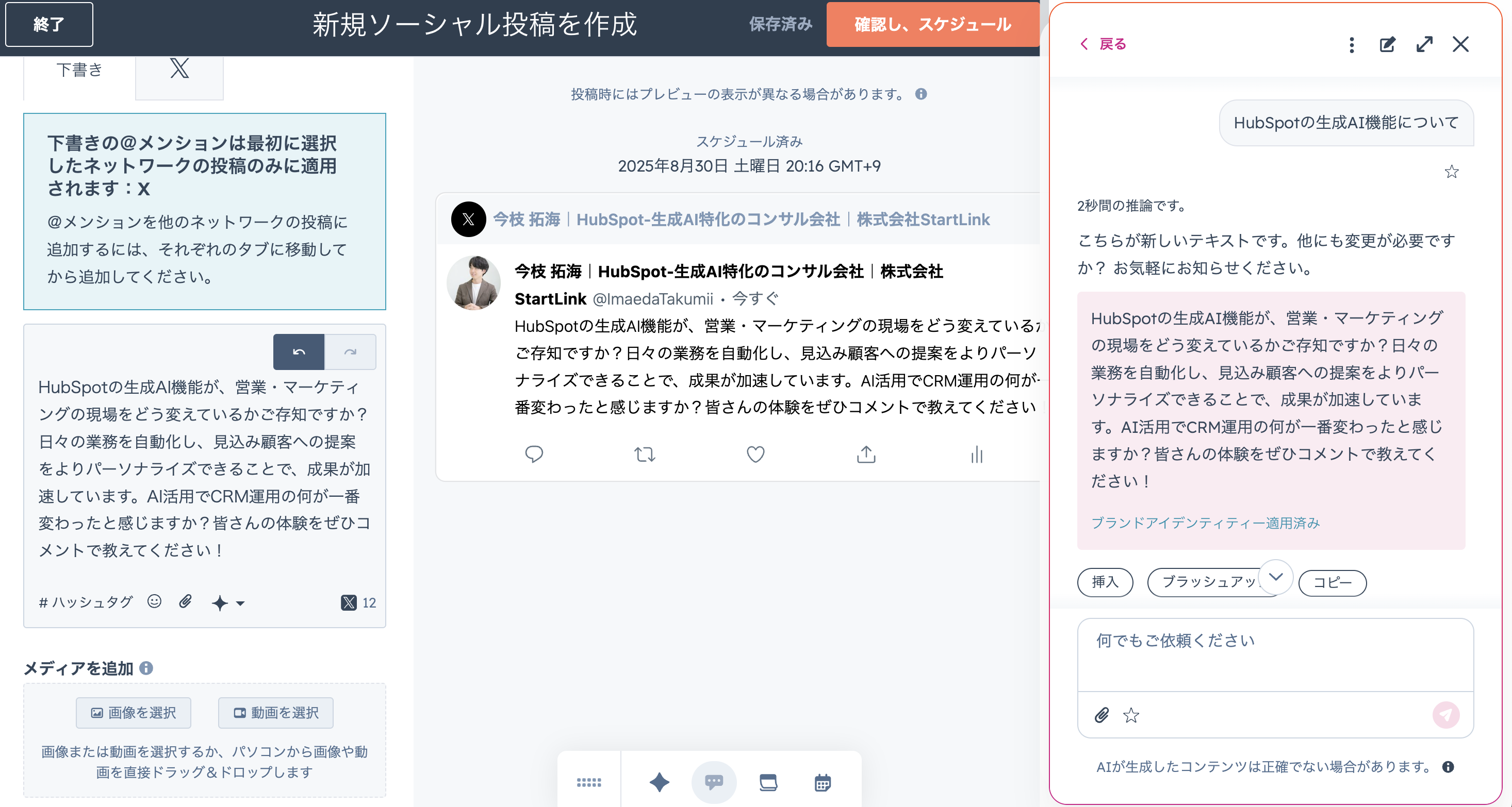 ソーシャルメディアは、潜在顧客との接点を広げる重要なチャネルです。HubSpotのソーシャル機能を使えば、Instagram、Facebook、X(旧Twitter)、YoutubeなどのSNSアカウントと連携し、投稿のスケジューリングや、投稿後のエンゲージメント(いいね、コメントなど)をCRMのコンタクト情報と紐づけて分析できます。