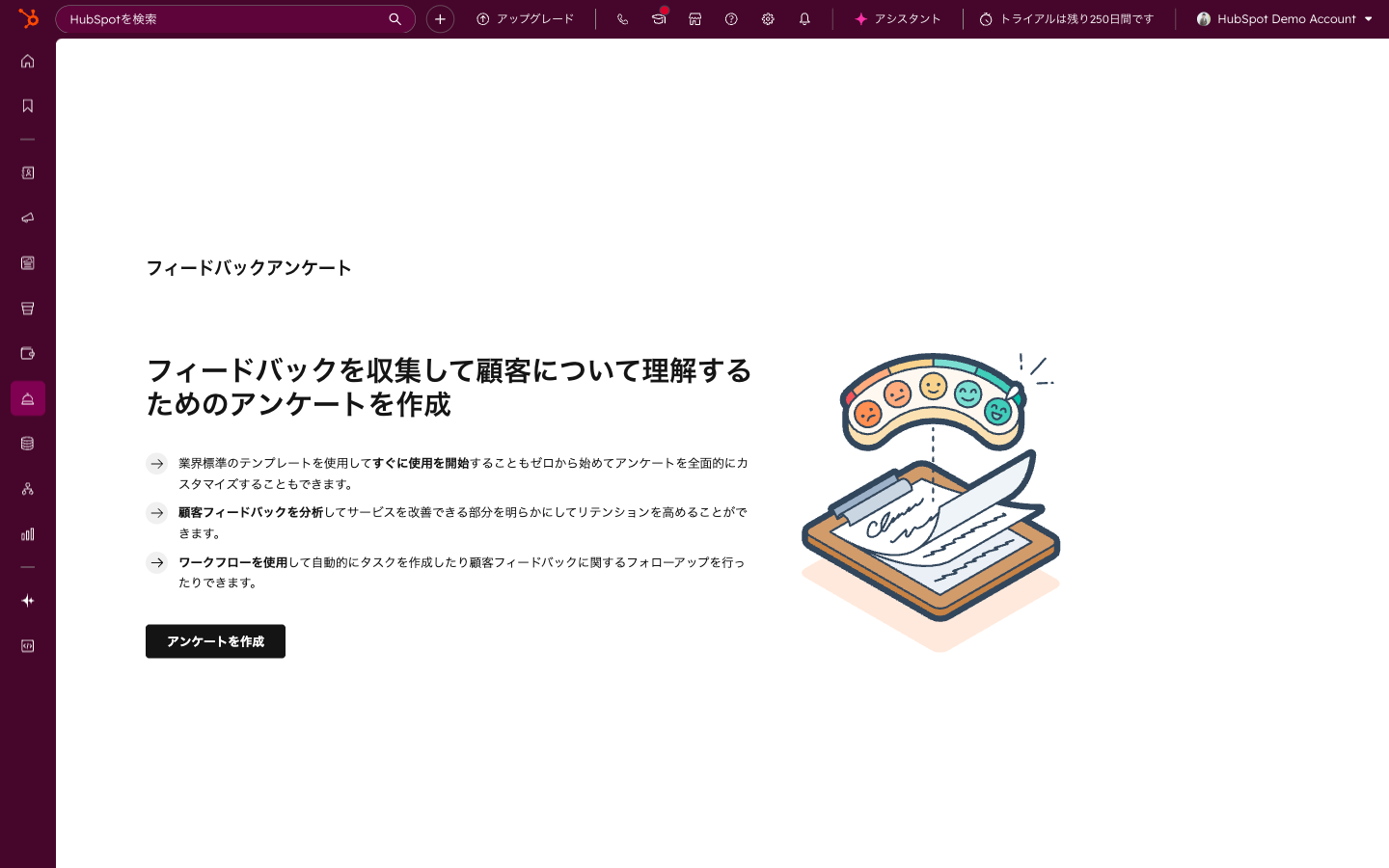 HubSpotのフィードバック機能を使えば、NPS・CSAT・CES・カスタムアンケートをCRMと連動した形で運用できます。アンケート結果が顧客レコードに自動的に蓄積されるため、「どの顧客が満足し、どの顧客が不満を感じているか」を一元的に把握できるのが最大の強みです。