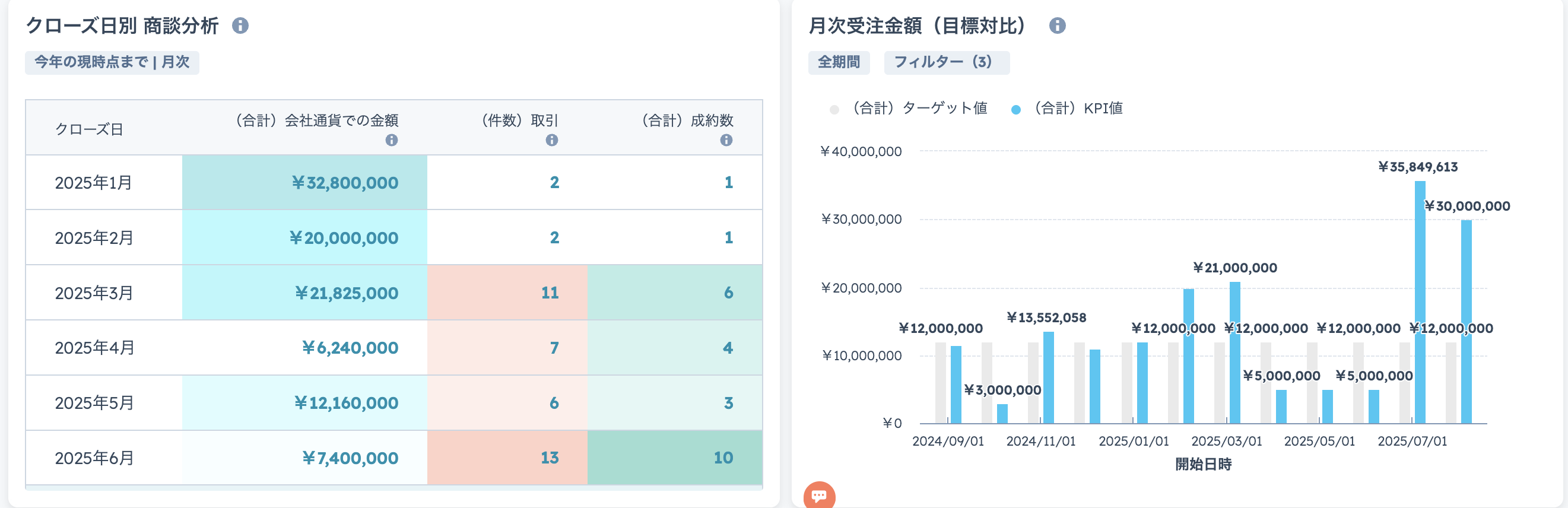 日々の営業活動を正確に記録していけば、それは貴重なデータとなり、次の一手を見出すための道標となります。HubSpotのレポート機能は、ビジュアル的に優れており、リアルタイムに数字を可視化できます。