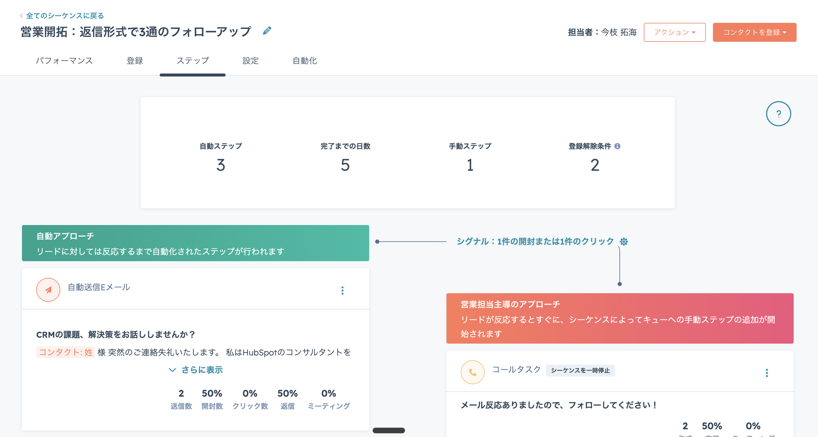 シーケンスは、複数のメールやタスクを組み合わせて、一連のセールスオートメーションを自動で実行する機能です。例えば、「初回メールの3日後に返信がなければ、自動でフォローメールを送信」「さらに2日後に返信がなければ、電話をするタスクを作成」といったフローを組むことができます。