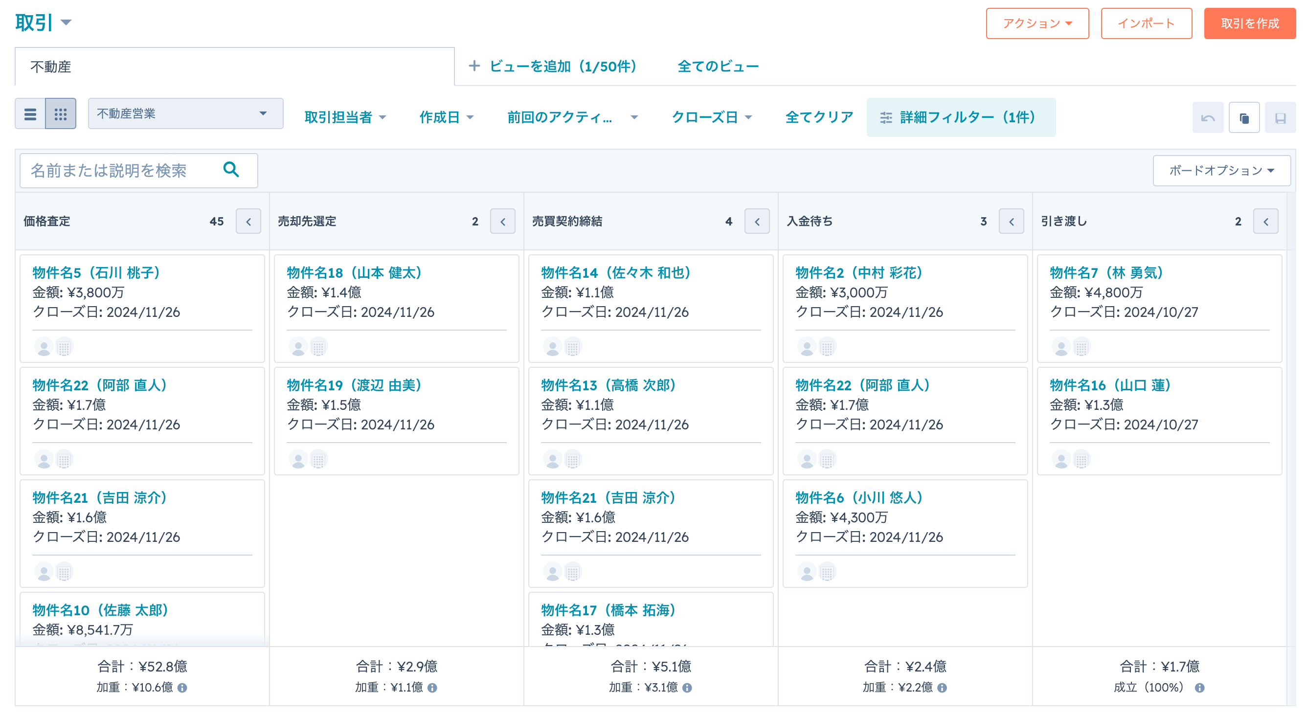 HubSpot Sales Hubの営業活動は、「取引」と呼ばれる機能を中心に行います。取引は、見込み客が成約に至るまでの一連のプロセスを管理する場所です。HubSpotの取引画面は、案件の進捗状況を視覚的に把握できる「カンバン方式」を採用しています。