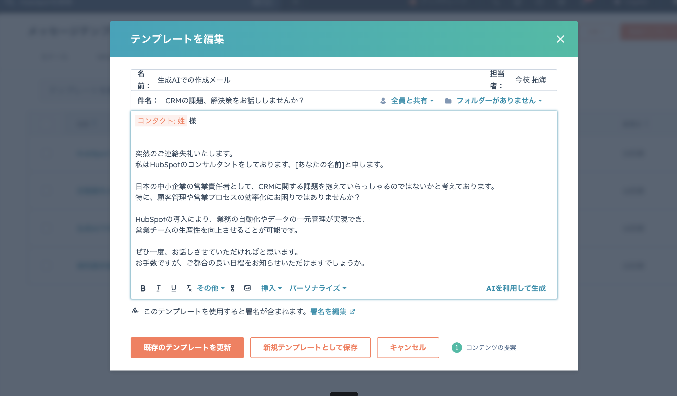 また、頻繁に送るメールの文章をテンプレートとして保存しておく機能も非常に便利です。営業担当者はゼロからメールを作る手間が省け、より迅速に顧客へアプローチできるようになります。さらに、チーム全体で効果的なテンプレートを共有することで、対応スピードを上げ、対応品質を統一することも可能です。