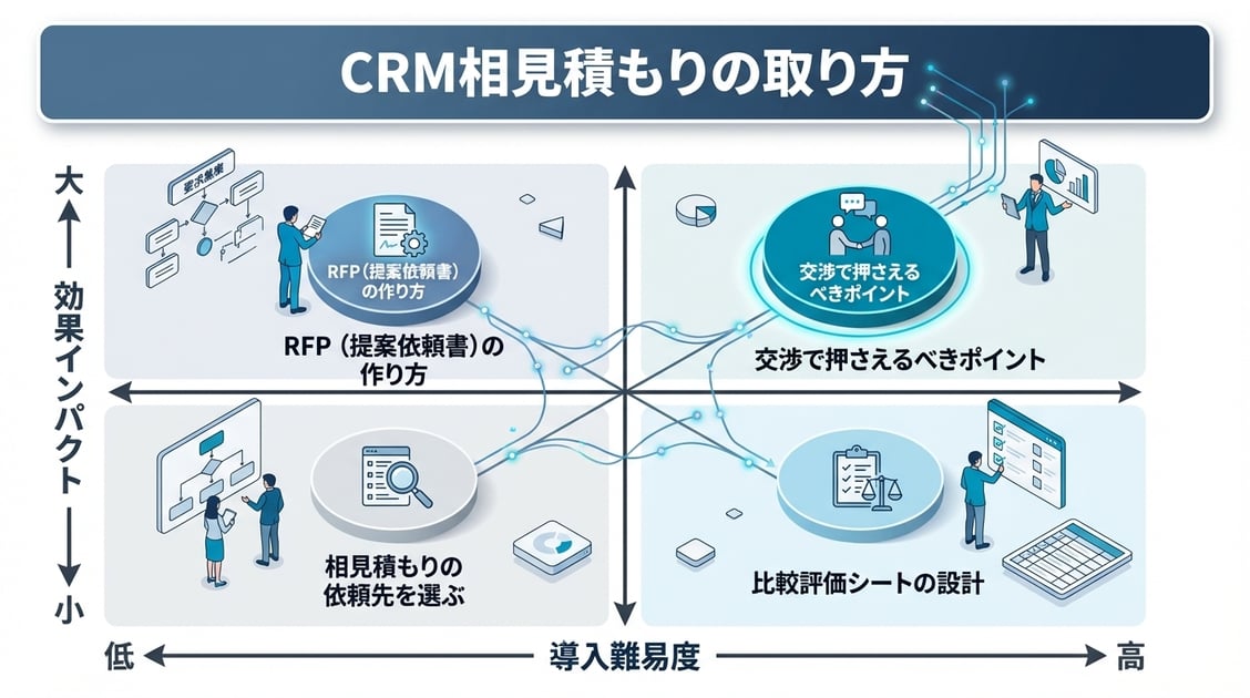 CRMの相見積もりは、単なる価格比較ではなく「自社の要件に対する適合度」を総合的に評価するプロセスです。