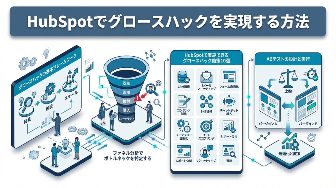 グロースハックとは、データ分析と高速な仮説検証サイクルを通じて、プロダクトやサービスの成長を加速させる手法です。HubSpotは、CRMデータの一元管理・自動化・レポーティングの3要素を備えているため、グロースハックの実験基盤として非常に適しています。