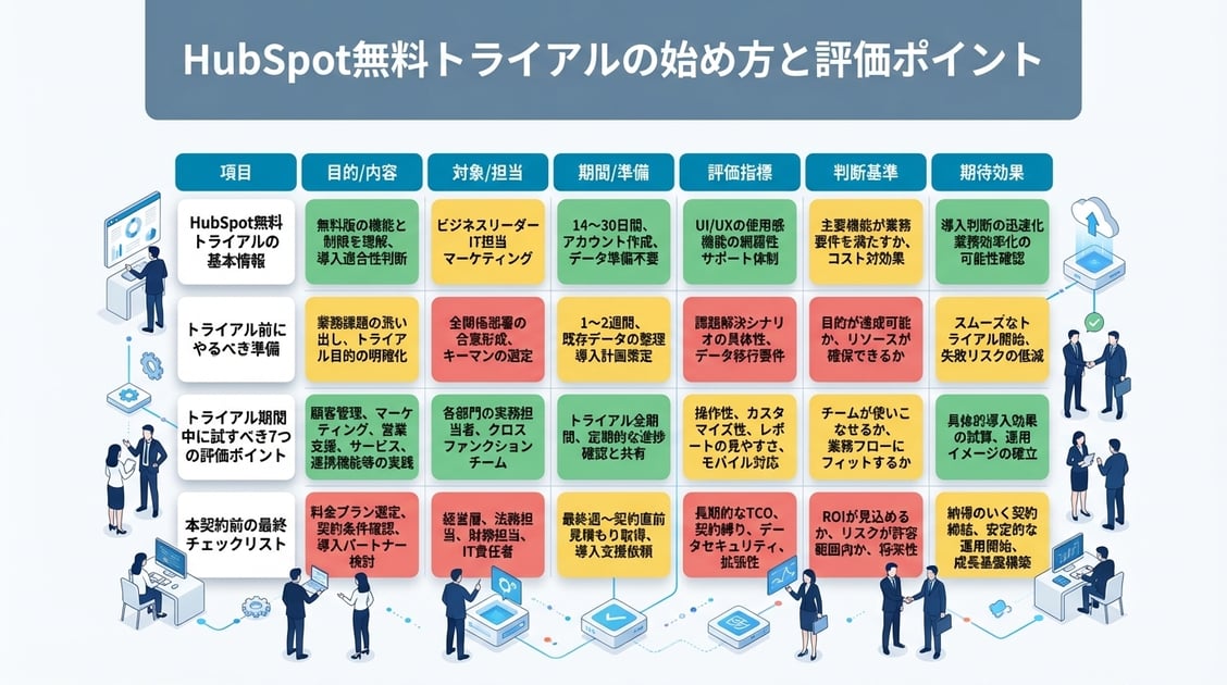 この記事では、HubSpot無料トライアルの始め方から、トライアル期間中に必ず確認すべき評価ポイント、本契約前の最終チェックリストまでを解説します。
