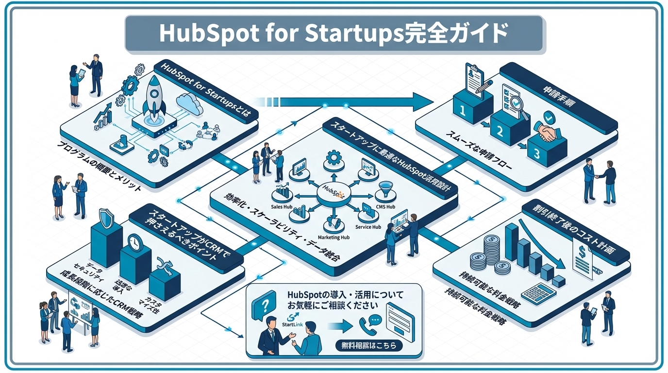 進め方としては、まず申請条件の確認と申請フォームの提出を済ませ、Starterプランの最小構成で運用を開始するのが現実的です。最初から多機能を詰め込むのではなく、事業成長に合わせてプランや利用するHubを段階的に拡張していく流れが、リソースの限られたスタートアップには最も投資対効果が高いアプローチになります。