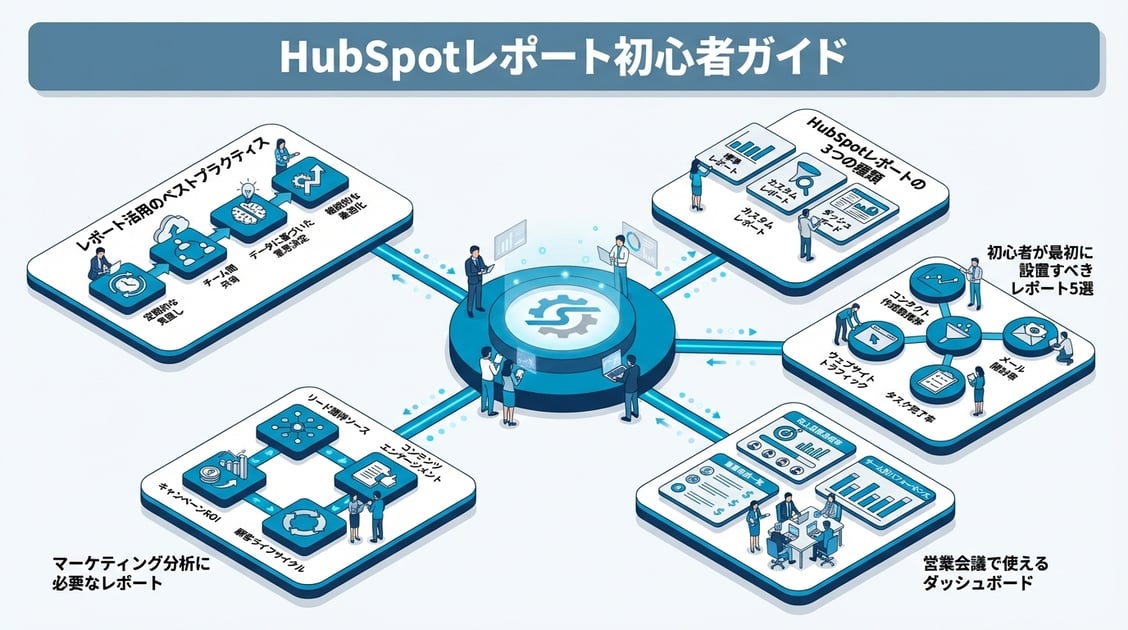 この記事では、HubSpotレポートの基本的な考え方から、初心者が最初に作るべきレポート、営業会議・マーケ分析での活用方法まで、ステップバイステップで解説します。