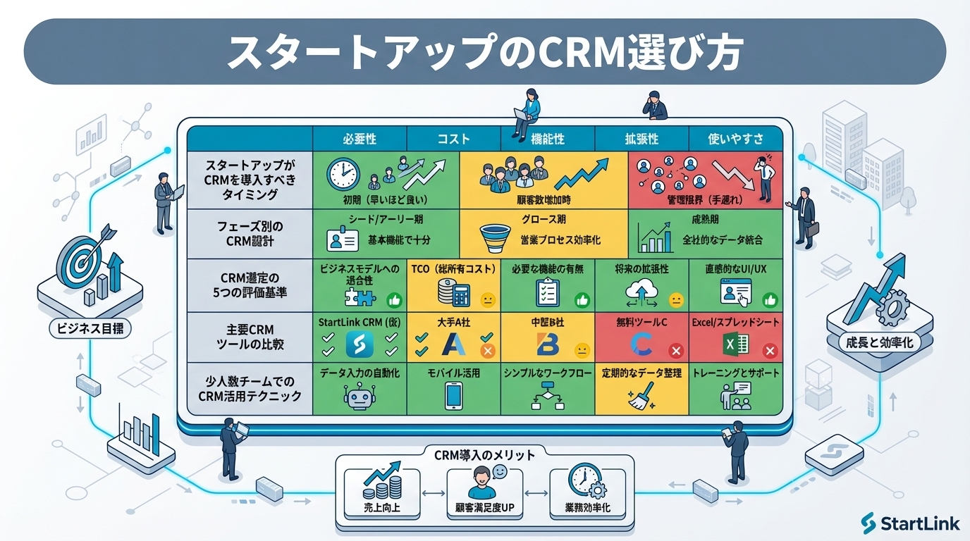 - スタートアップのCRM選びは、「今の規模」ではなく「1〜2年後の成長」を見据えて判断することが重要です