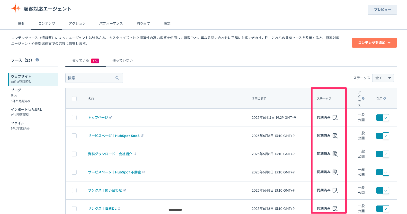 - コンテンツソースの管理: トレーニングに使用するコンテンツソースは後から追加、編集、削除できます。同期されたナレッジベース記事は更新時に自動で再同期され、その他のソースも週1回自動で再同期されます。