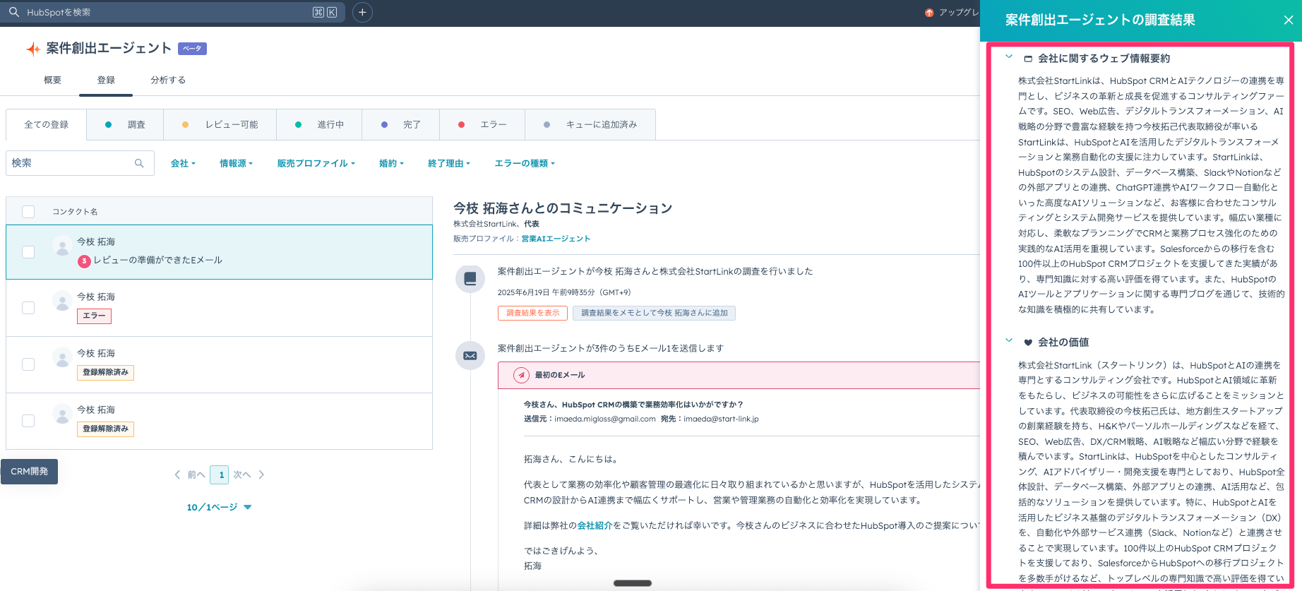 HubSpotの案件創出エージェントは、このような事前リサーチや、アプローチメールの作成などの”(現時点では)簡易的な”代行を行ってくれる機能を持っています。