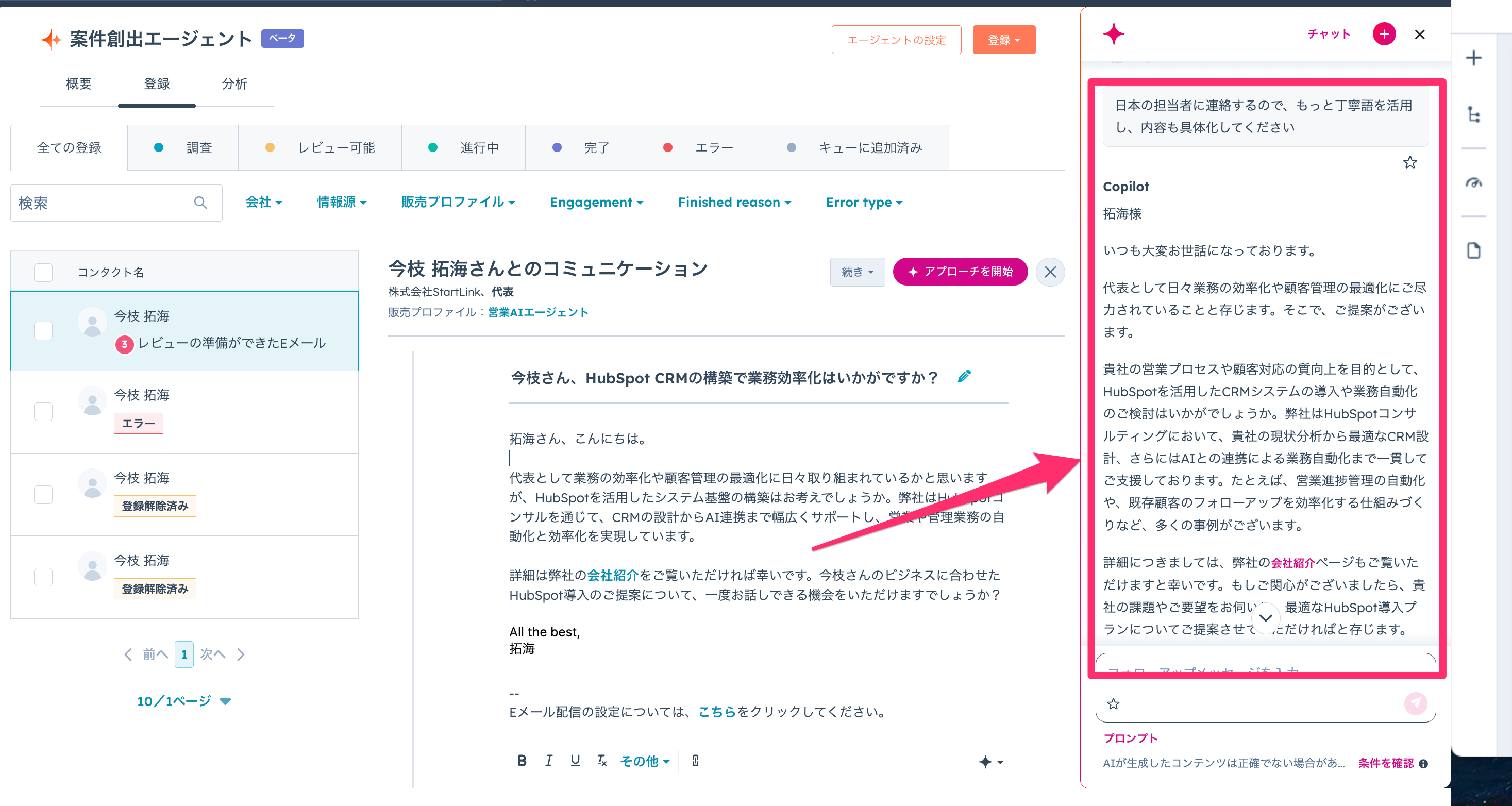 ですので、HubSpotの案件創出エージェントは、その機能だけで初回から代行業務が完結するのではなく、あくまで代案となるメールを文章で作成し、そこから人が修正したり、他のAIに食わせて内容をリッチ化したりというような使い方が良いのかと思っております。