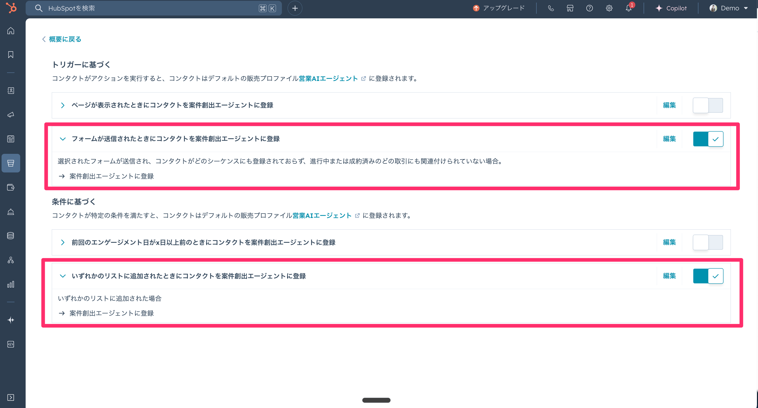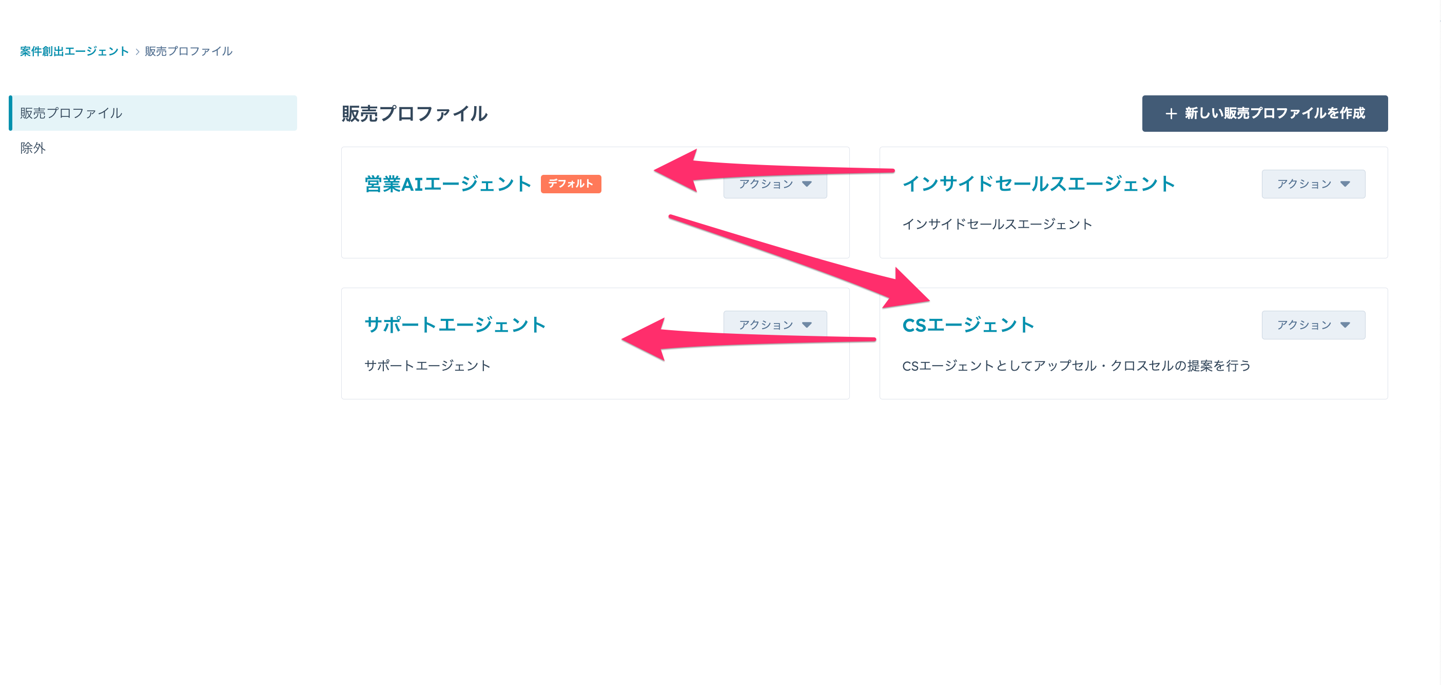 HubSpotの案件創出AIエージェントは複数のプロファイルで設定することができ、