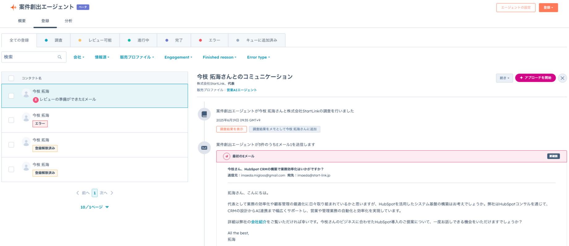AIがリサーチを行い、3通のメール文面をドラフトとして作成します。ただし、送信はせず、人間の担当者が内容を確認・承認した上で手動で送信を開始します。