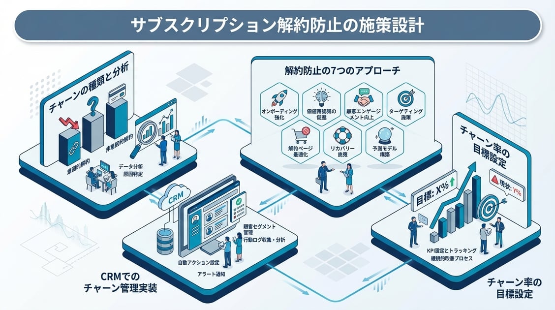 サブスクリプションの解約防止は、「解約が発生してから対処する」のではなく、「解約の予兆を早期に検知し、先手を打つ仕組み」を設計することが核心です。